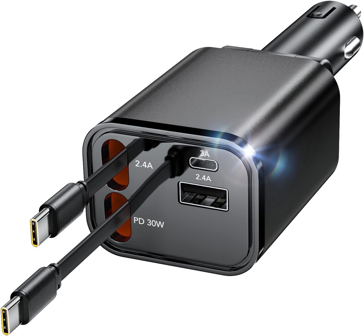 [Flexible Retractable Car Charger] This 4 in 1 retractable car charger allows you to pull out the cable within a range of 80cm(2.6ft) for use, and our iphone car charger retracts back automatically for safe and tidy storage without any cable entanglement. This convenient design of this with iphone 17 car charger facilitates easy and practical charging control and usage experience. A versatile car charger and travel essential, perfect as gifts for men and women.